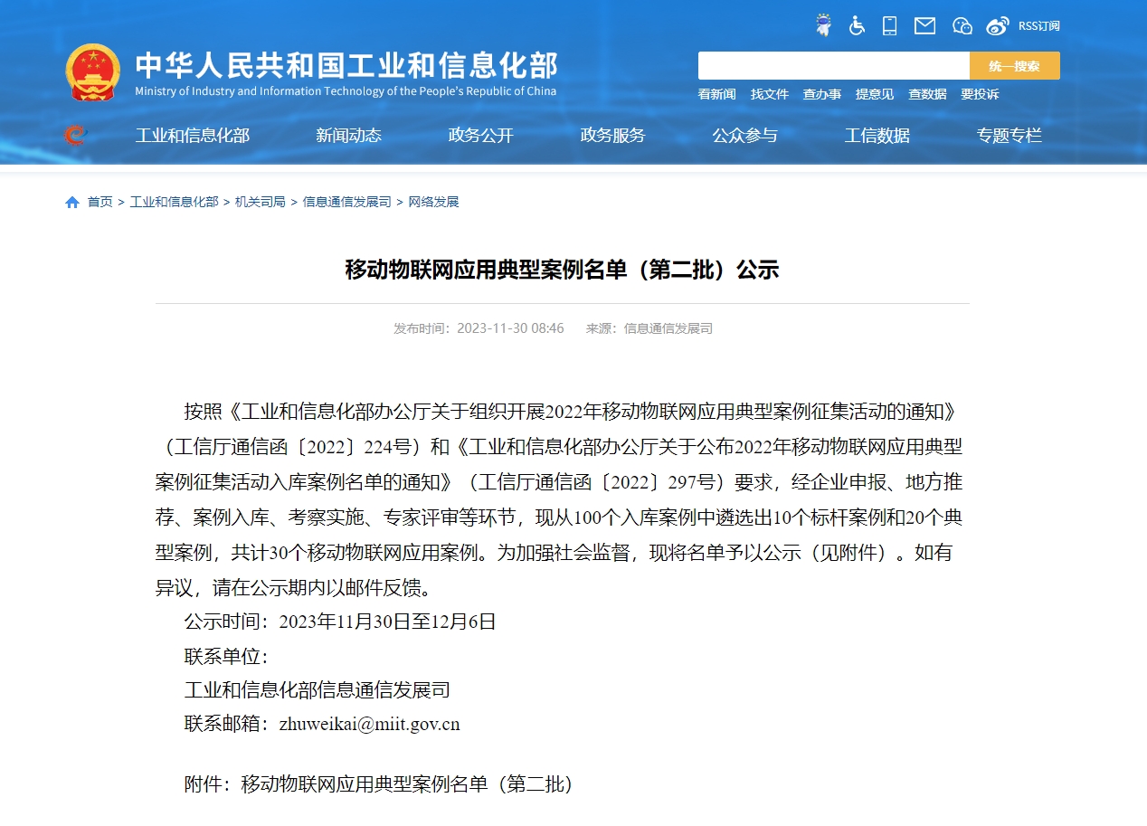 2023年11月30日,國家工業和信息化部在其官方網站對2023年《移動物聯網應用典型案例名單(第二批)》進行公示,經地方推薦、案例入庫、考察實施和專家評審等環節,從100個入庫案例中遴選出10個標桿案例和20個典型案例,共計30個移動物聯網應用案例。其中,峻海物聯在智慧消防領域的“智慧安全監測與應急指揮綜合平臺系統研究”成功入選典型案例。