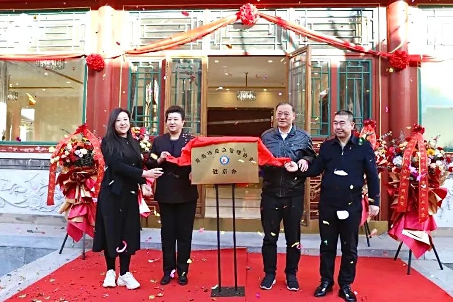 儀式現(xiàn)場,中國應(yīng)急管理學(xué)會應(yīng)急產(chǎn)業(yè)工作委員會副主任委員兼秘書長、青島市應(yīng)急管理協(xié)會會長張旭明(左二),青島市應(yīng)急管理協(xié)會常務(wù)副會長張國勝(右二),青島市應(yīng)急管理協(xié)會輪值會長林智艷(左一),青島市應(yīng)急管理協(xié)會副會長孫素朋(右一)共同為青島市應(yīng)急管理協(xié)會駐京辦事處揭牌。