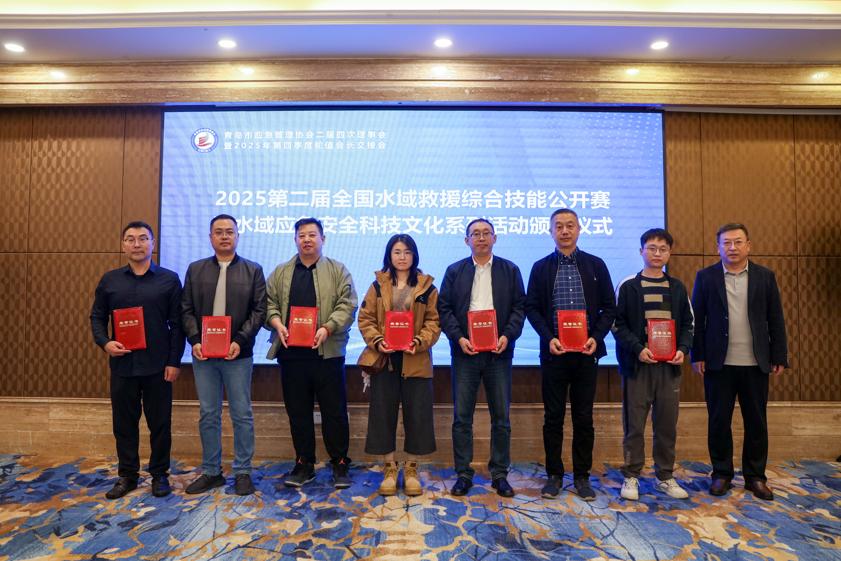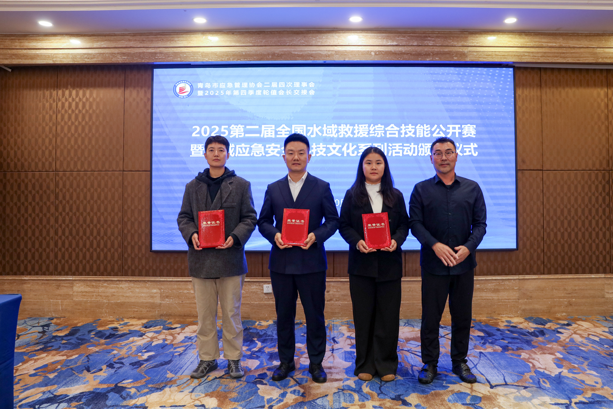 副會(huì)長(zhǎng)張恩民為青島峻海物聯(lián)科技有限公司(左三)等公司頒發(fā)“2025第二屆全國(guó)水域救援綜合技能公開賽暨水域應(yīng)急安全科技文化系列活動(dòng)突出貢獻(xiàn)獎(jiǎng)”。